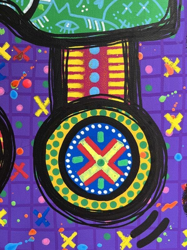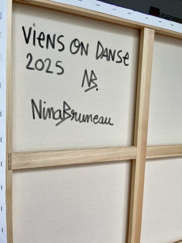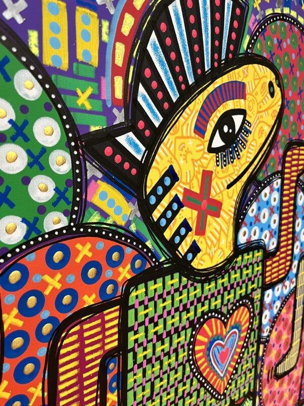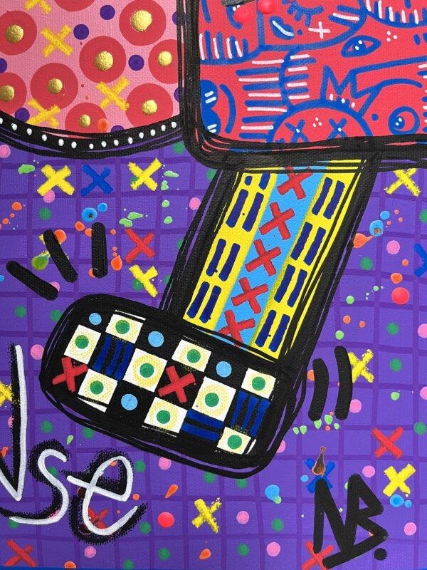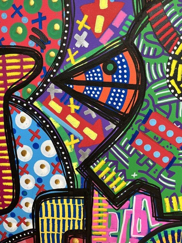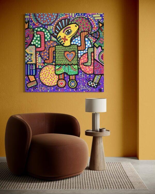En fusionnant la vivacité du pop art avec les formes géométriques et semi-abstraites, l’instinct de l’art brut et mon amour de l’art antique, comme ici, l’art Égyptien de part leur posture, j’ai voulu capturer un esprit de joie et d’unité, symbolisé par des motifs vibrants et des personnages ludiques qui dansent sous un ciel animé de boules à facettes.