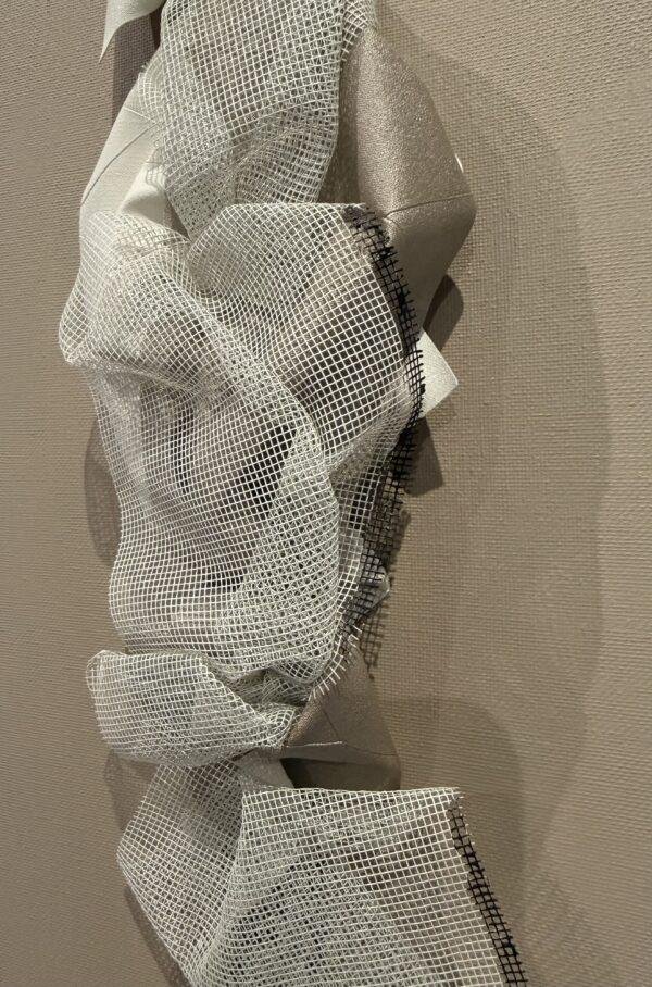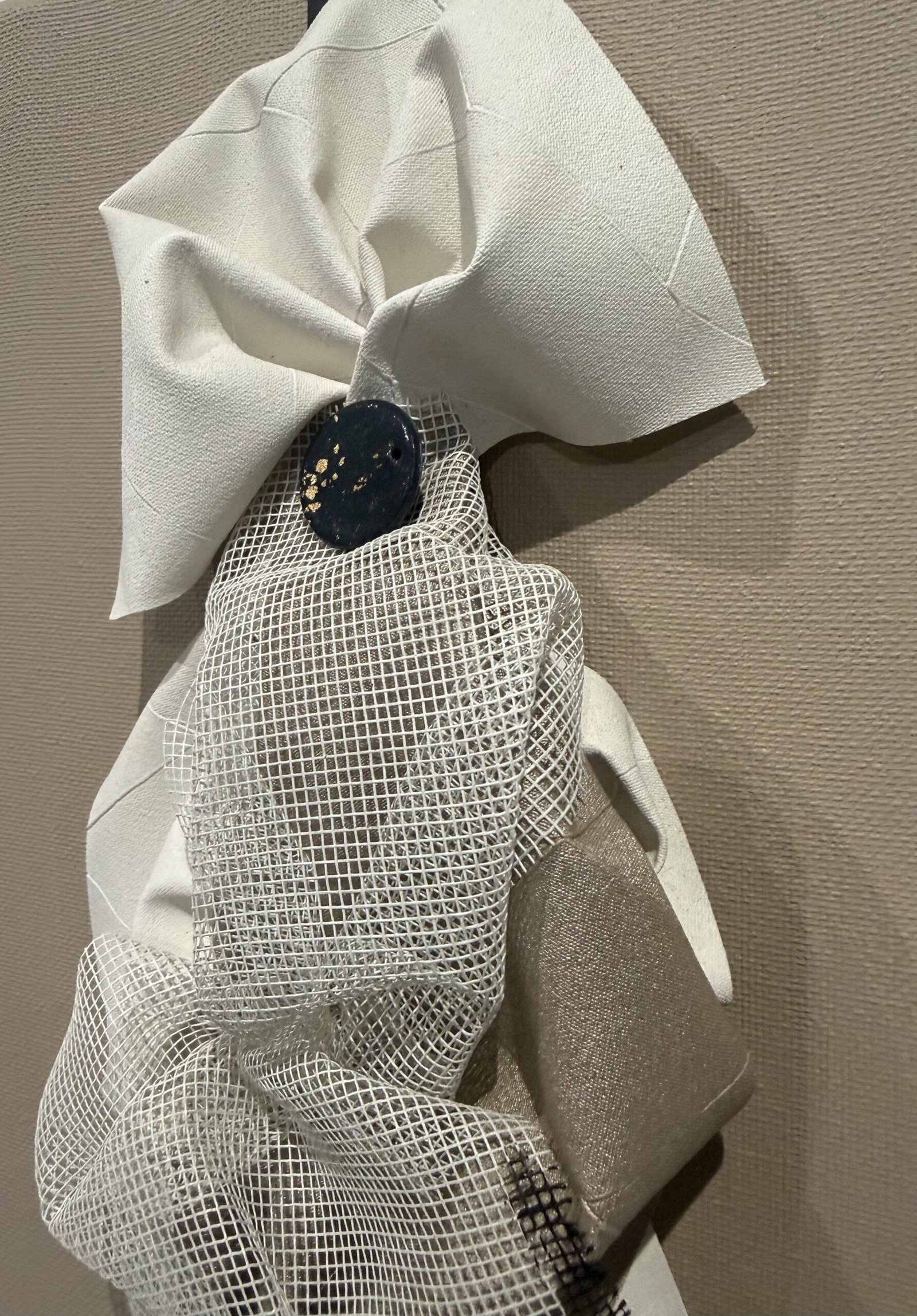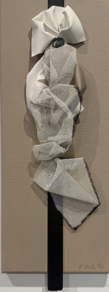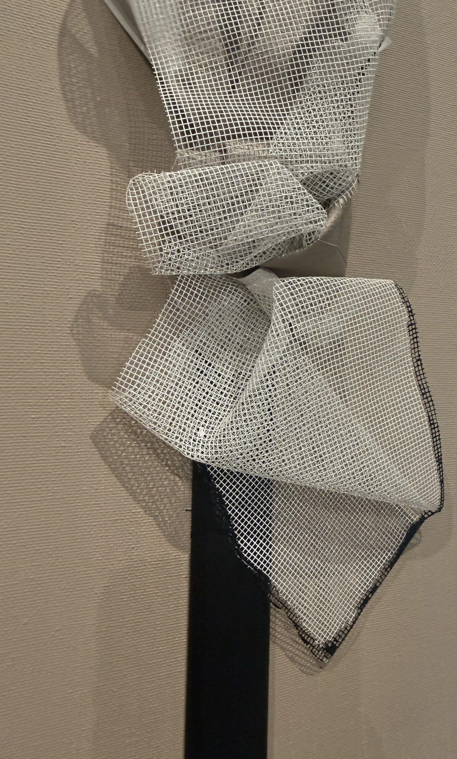 Une toile beige et noire, traversée d’une ligne de bois qui ancre la légèreté dans une tension.